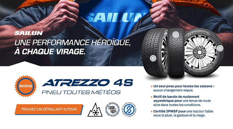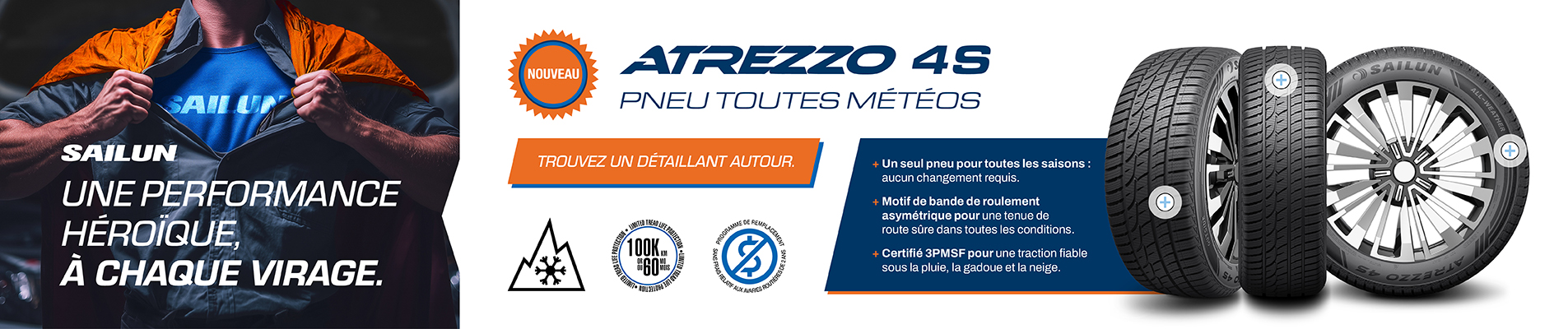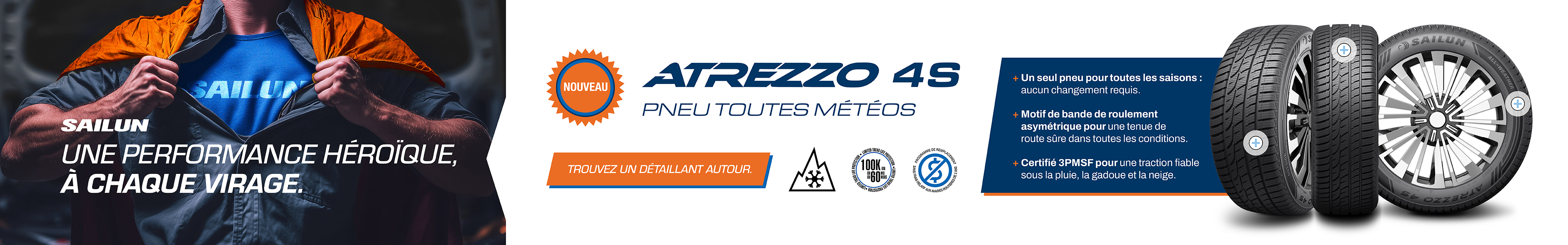 QUATRE SAISONS. UN SEUL PNEU. Voici le pneu Sailun Atrezzo 4S, conçu pour offrir des performances fiables en toute saison. Grâce à un dessin de la bande de roulement asymétrique unique, le pneu Atrezzo 4S offre une meilleure adhérence et un meilleur contrôle sur la chaussée mouillée et l’hiver. Son composé de caoutchouc spécialement formulé demeure souple à des températures inférieures à zéro, ce qui garantit des performances constantes tout au long de l’année. Conçu pour les conducteurs qui doivent affronter la neige et le froid de façon occasionnelle, il allie la réactivité d’un pneu de performance toutes saisons à la traction fiable des pneus d’hiver de Sailun. L’homologation 3PMSF (3 Peak Mountain Snowflake) du pneu Atrezzo 4S garantit ses performances sur les routes enneigées, ce qui en fait la solution idéale pour la météo imprévisible de l’Amérique du Nord. Tempête de neige, pluie battante ou chaussée brûlante par une journée ensoleillée : quelles que soient les conditions météorologiques, ce pneu offre un confort, une conduite silencieuse et une adhérence sans compromis.